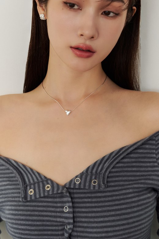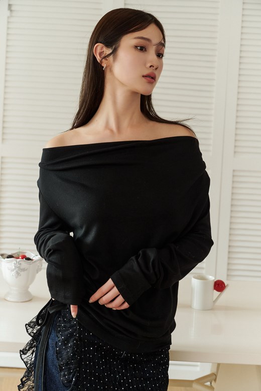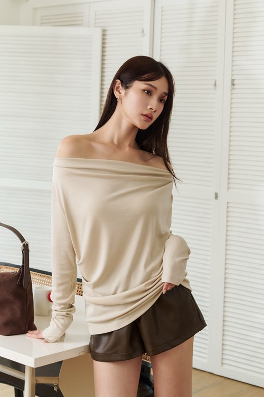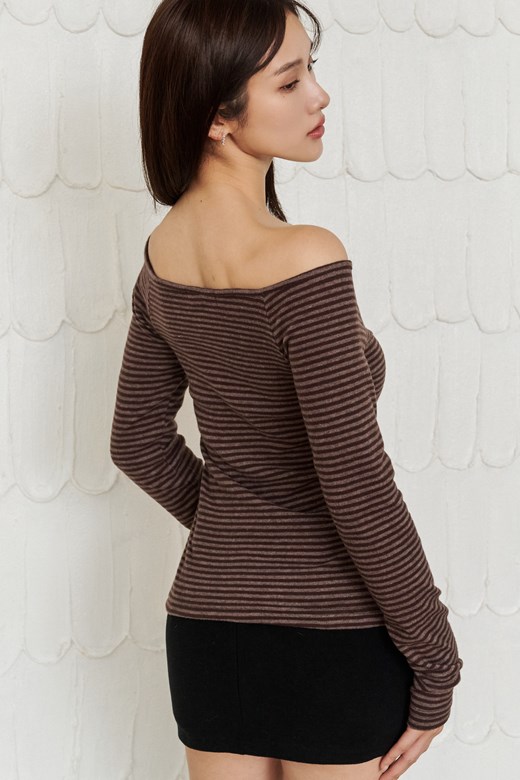 一字領排釦條紋長袖上衣