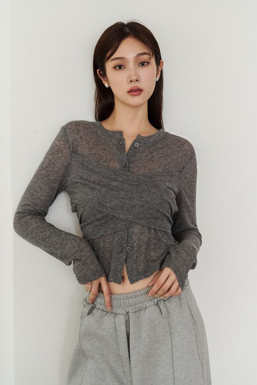 透膚排釦綁帶長袖上衣