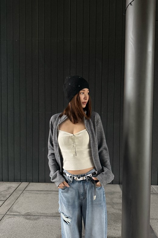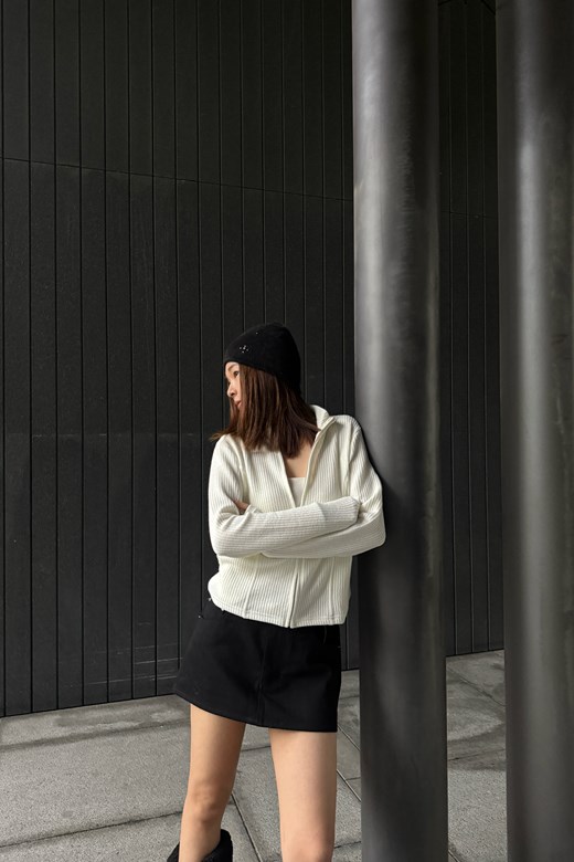 立領坑條針織拉鍊外套