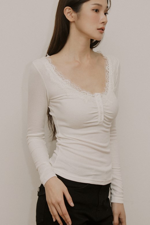 法式蕾絲圓領排釦長袖上衣