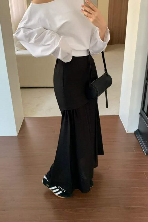 腰頭反折抽繩層次長裙