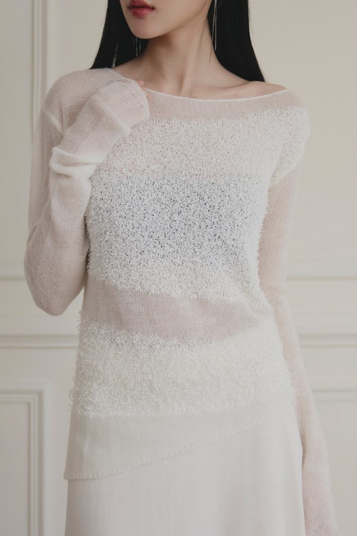 毛毛感拼接斜肩針織上衣