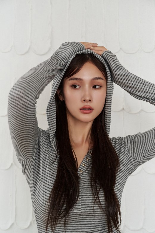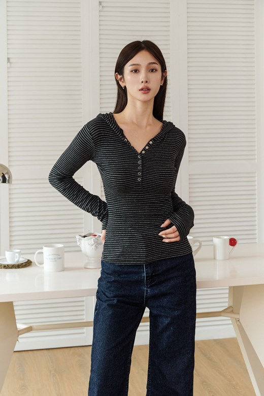 連帽條紋排釦長袖上衣