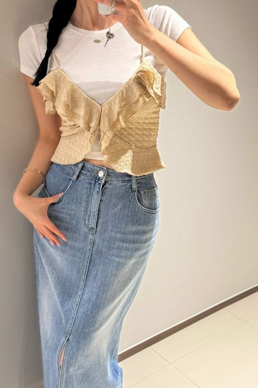 V領荷葉細肩短版上衣